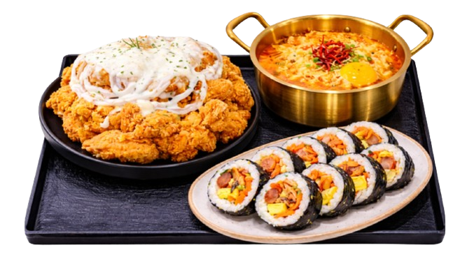 Creamy onion fried chicken, traditional ramen, traditional kimbap.