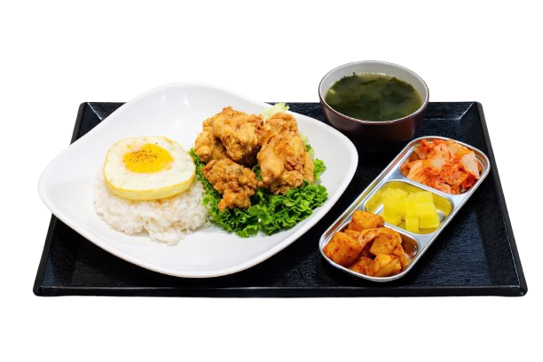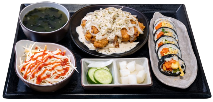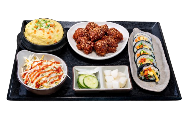 - 150g fried chicken (choice of sauce), steamed egg, 1/2 traditional kimbap, salad.